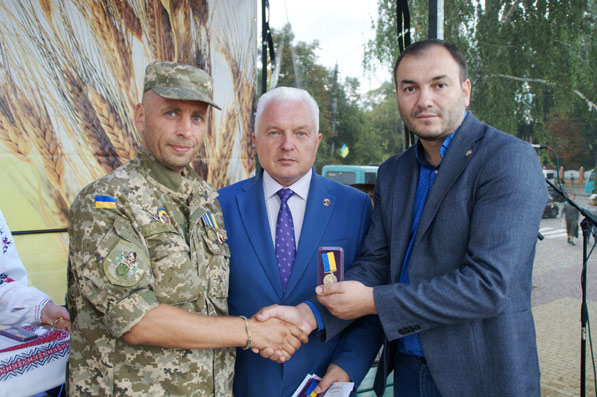 Під час промови міський голова нагадав, що нині цю незалежністю зі зброєю у руках відстоюють наші славні воїни. На знак вдячності за мужність, саможертву та патріотизм десятьом учасникам АТО міський голова спільно з секретарем міської ради Ярославом Годунком вручили медаль «Князя Бориса» та грошову винагороду. Громада оплесками вітала наших відважних воїнів на знак вдячності за їх подвиг і героїзм. Також з нагоди 26-ї річниці Незалежності України достойні представники громади міста отримали Почесні грамоти та Подяки Київської обласної ради, а також Почесні грамоти та Подяки виконавчого комітету міської ради. У рамках урочистостей Анатолій Соловйович передав через місцевих волонтерів підписаний громадою прапор України для воїнів у зону АТО. Волонтери ж у свою чергу, вручили «Орден матері бійця АТО» бориспільським матерям, які дочекалися синів із війни.