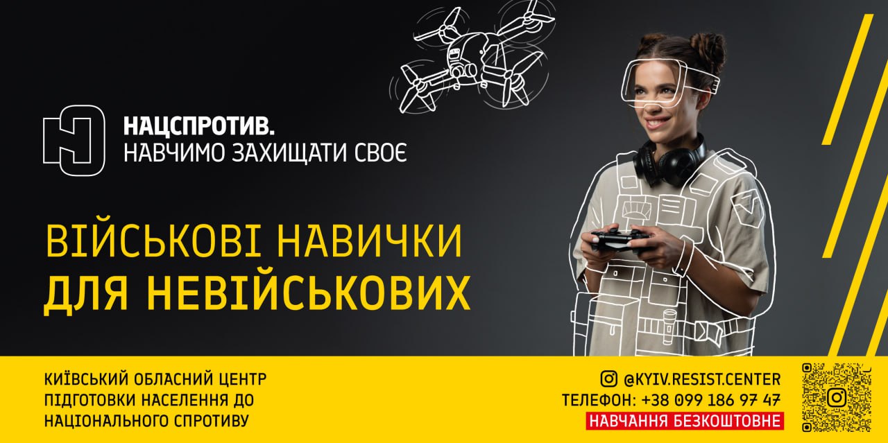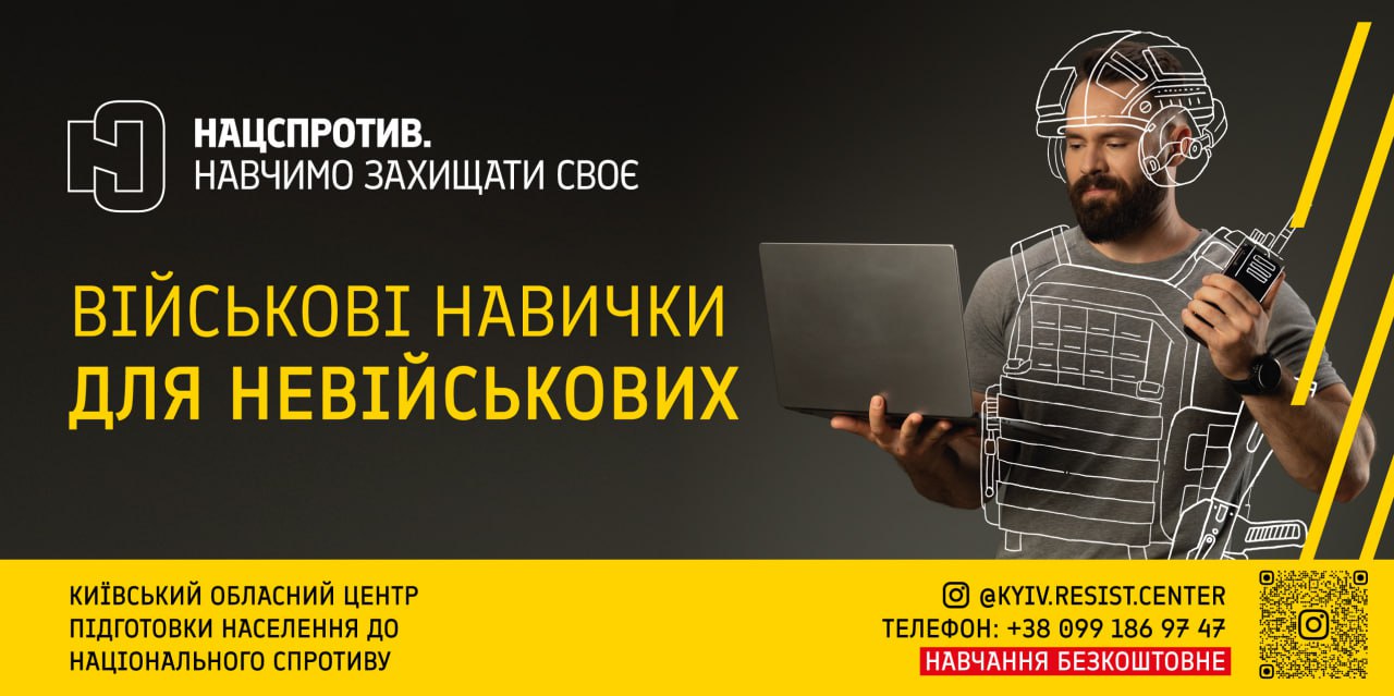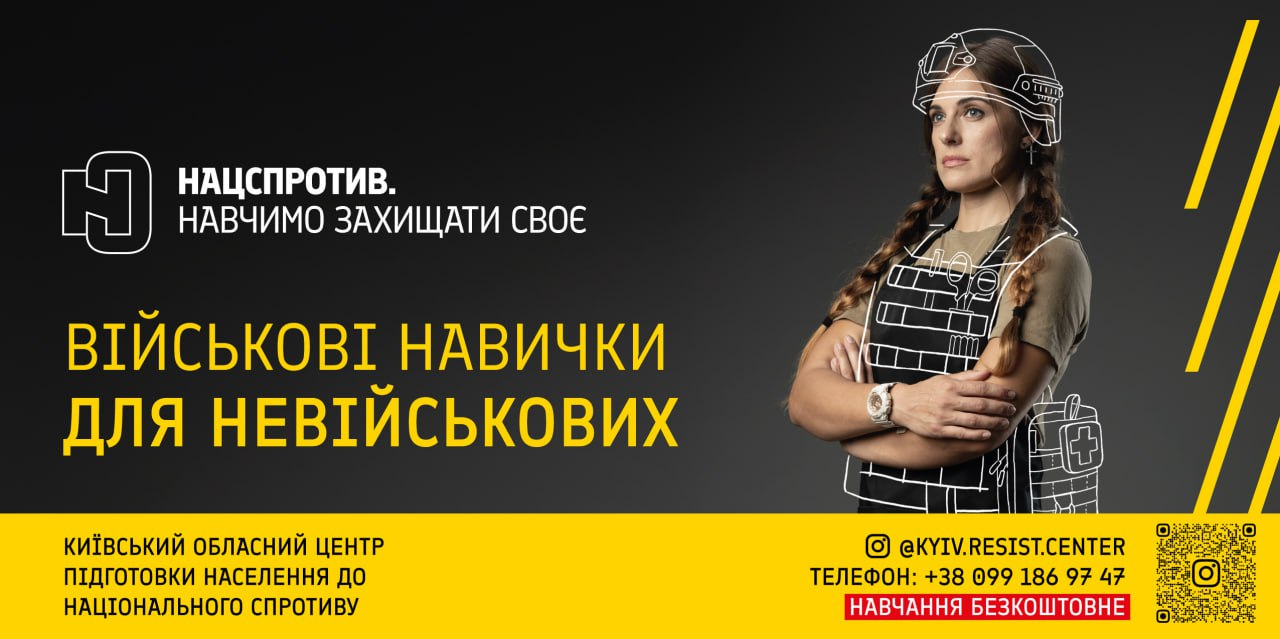 Проводимо одноденні вишколи та 7-тижневий базовий курс військової підготовки за 16 напрямами. Для мешканців Київщини. Заняття по вихідних. Безкоштовно»