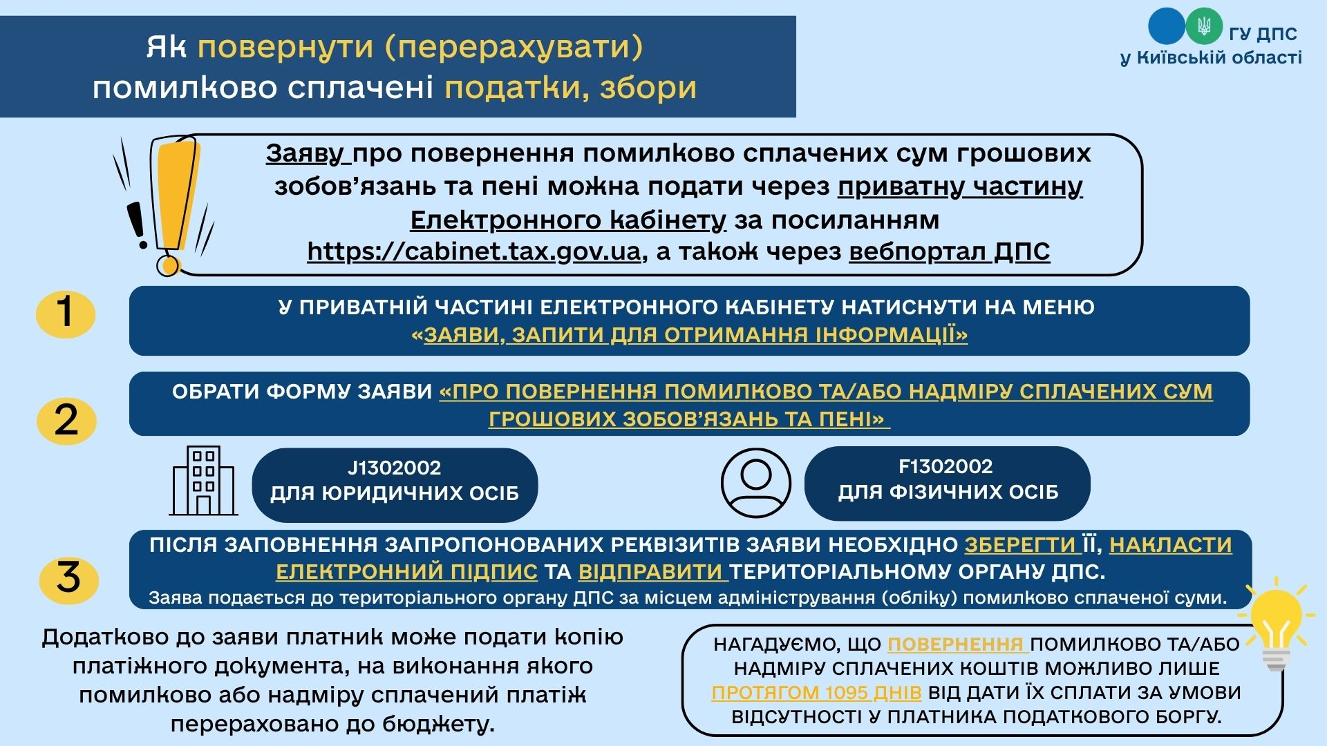 Заява подається до територіального органу ДПС за місцем адміністрування (обліку) помилково та/або надміру сплачених сум грошових зобов’язань та пені.
