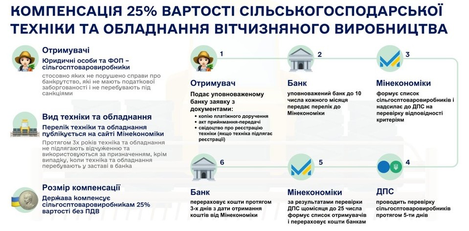 Часткова компенсація надається сільськогосподарським товаровиробникам на безповоротній основі за придбані техніку та обладнання, вартість яких зазначена в актах приймання-передачі та інших документах, що підтверджують оплату через уповноважений банк, у розмірі 25 відсотків вартості (без урахування податку на додану вартість).