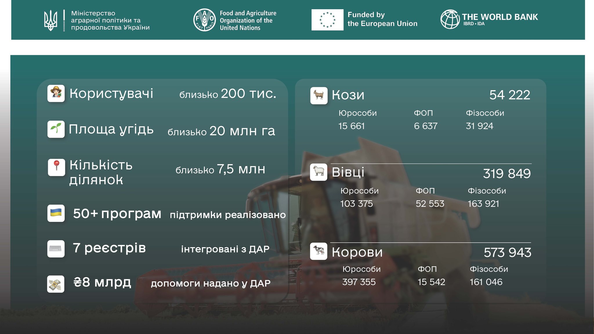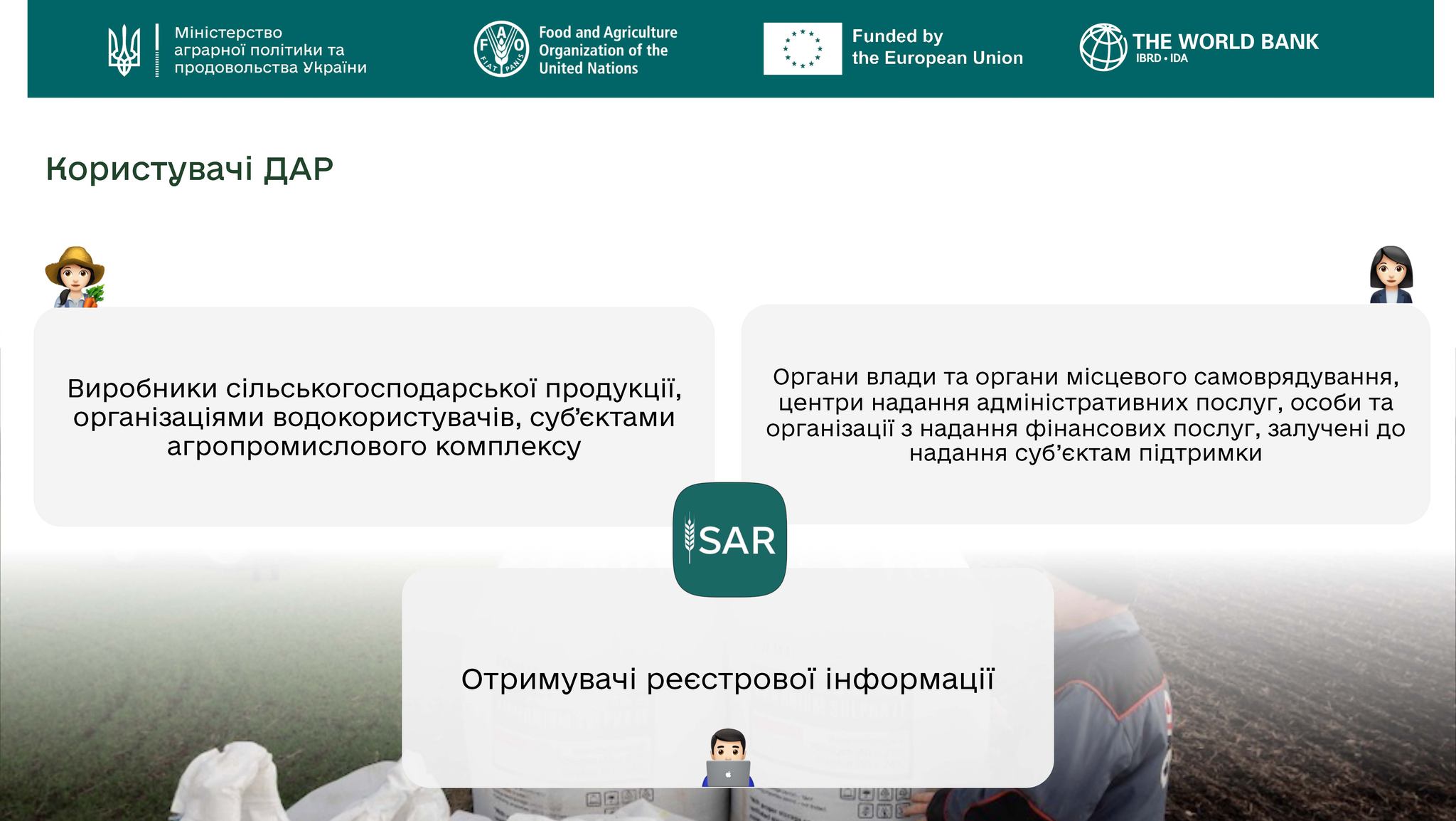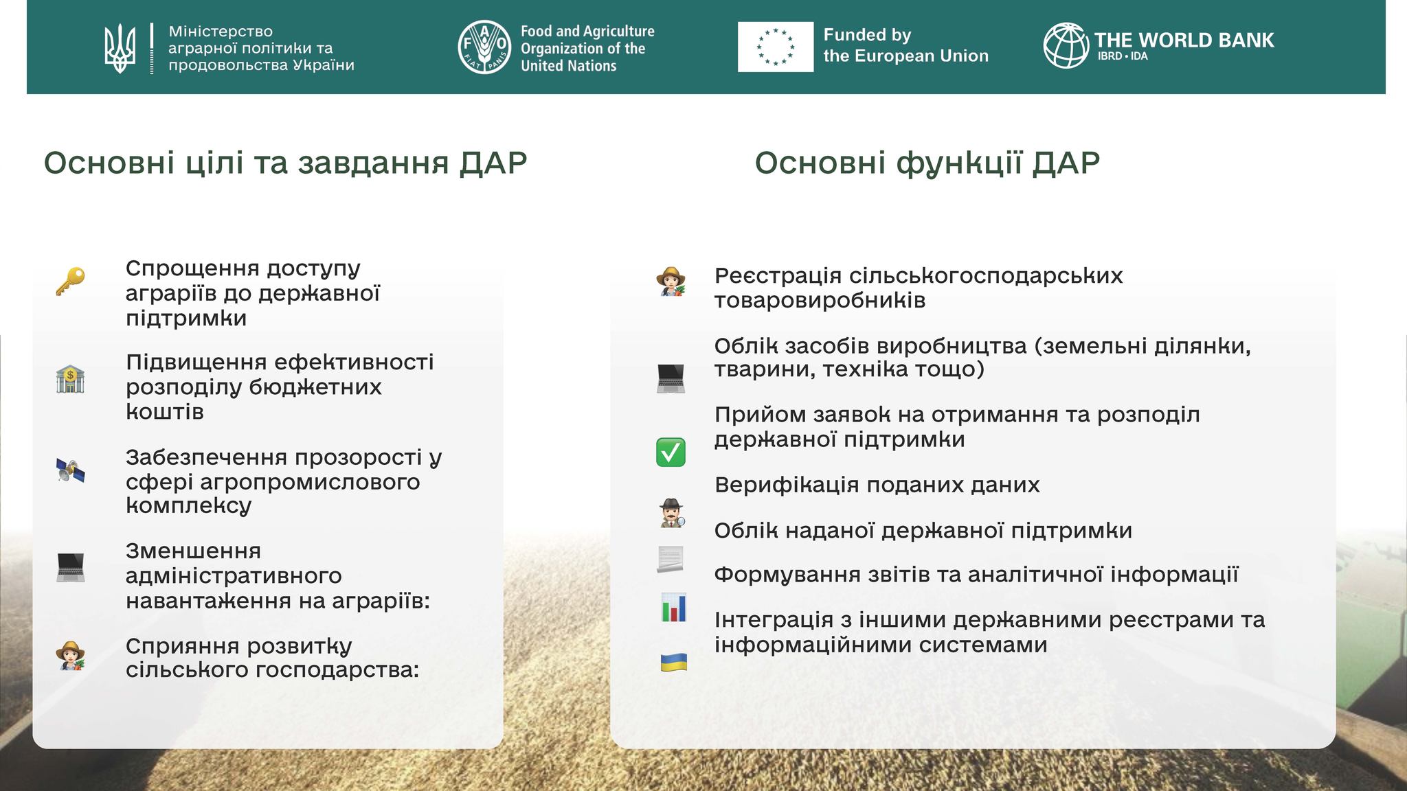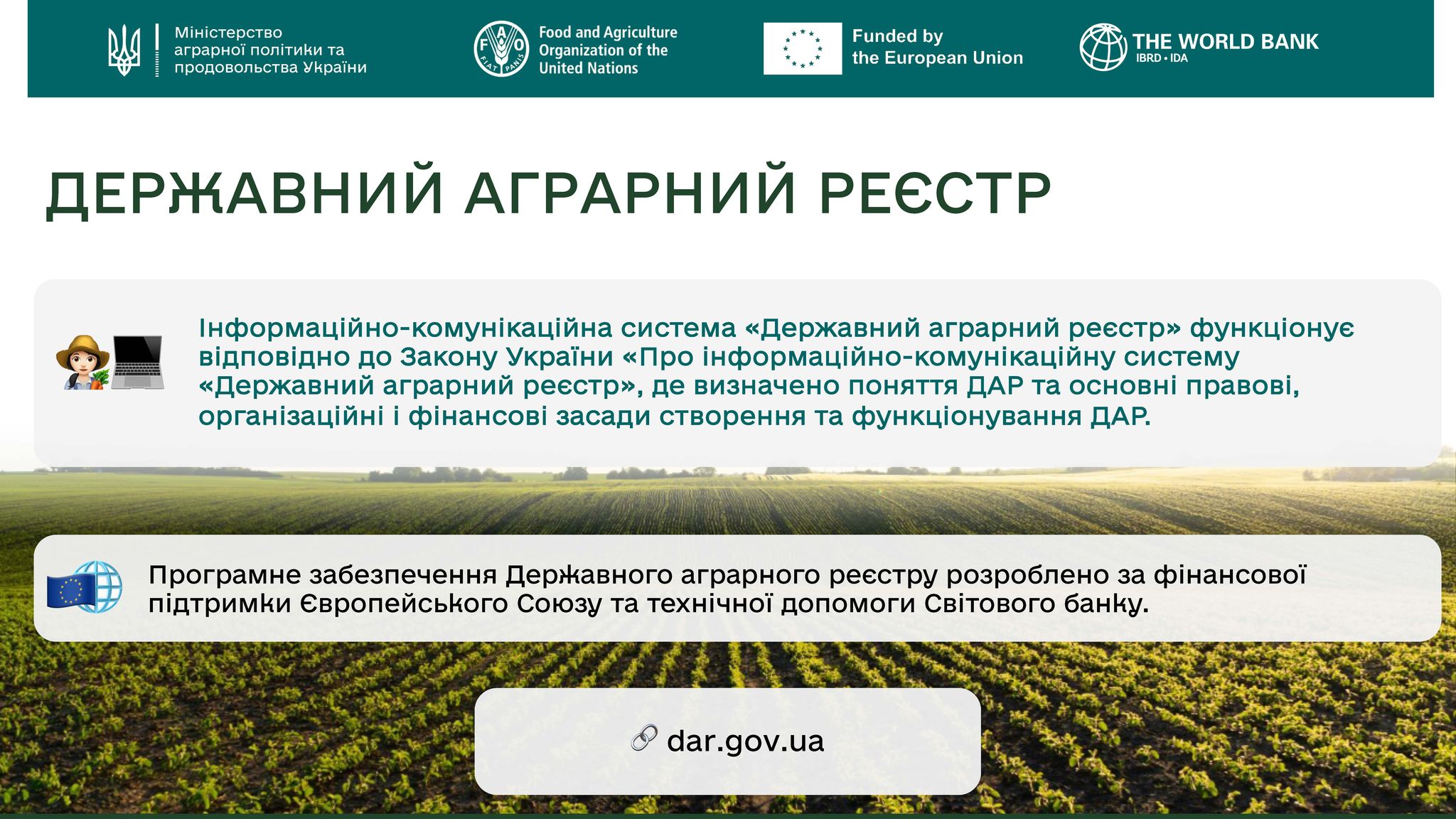 Державний аграрний реєстр (ДАР) – пряма допомога українським фермерам та агровиробникам на відстані кількох кліків Державний аграрний реєстр (ДАР) — інформаційно-комунікаційна система, що забезпечує збирання, накопичення, інтегрування, зберігання, захист, облік, відображення, оброблення, конфіденційність реєстрових даних, надання та використання реєстрової інформації, надання адміністративних та інших публічних послуг суб’єктам, електронний обмін даними у сферах забезпечення формування та реалізації державної аграрної політики, державної політики у сферах сільського господарства та з питань продовольчої безпеки держави.